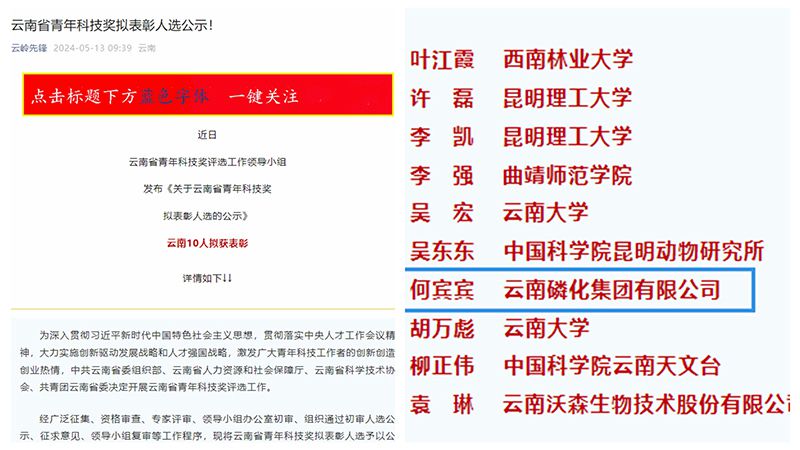 近日,云南省青年科技獎評選工作領(lǐng)導(dǎo)小組發(fā)布了《關(guān)于云南省青年科技獎擬表彰人選的公示》,公司研發(fā)中心磷化工團(tuán)隊負(fù)責(zé)人何賓賓擬獲得“云南省青年科技獎”榮譽(yù)。